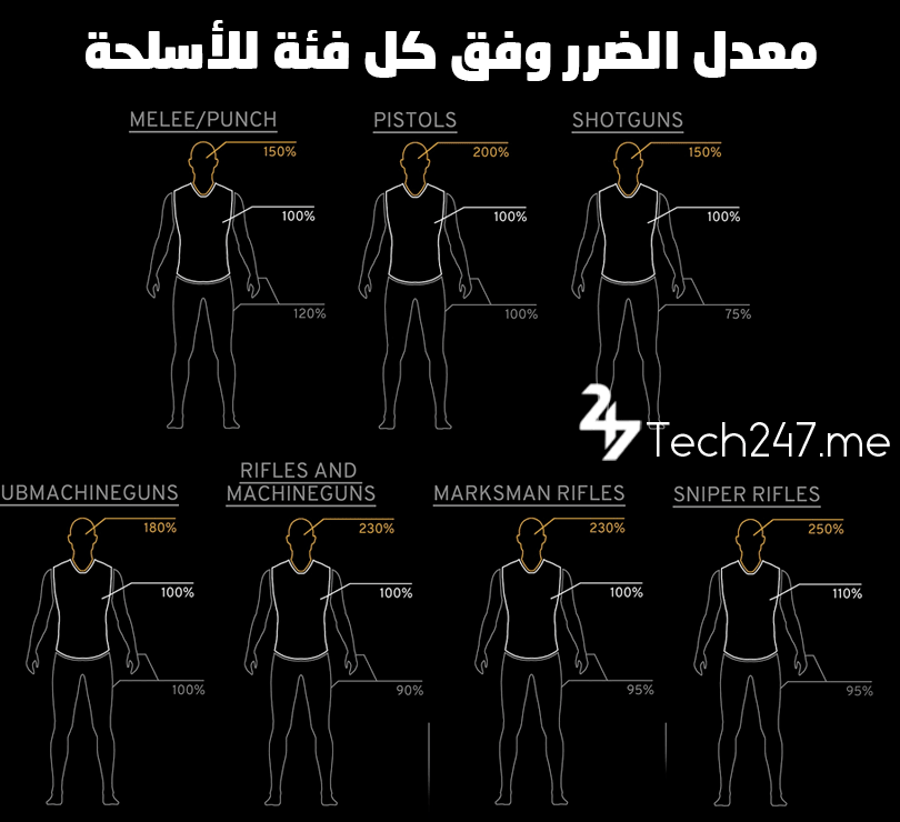في البداية عليك النظر إلى الصورة أعلاه وتذكر النسب الخاصة بها، حيث يجب أن تقوم بضرب النسبة الخاصة بجزء الجسم بشكل عام، بالنسبة الخاصة بجزء الجسم بالنسبة لكل فئة أسلحة لتحصل على نسبة الضرر الأساسي الناتجة.